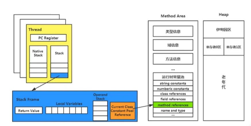 每一个栈帧内部都包含一个该栈帧所属的方法---->对 运行时常量池 的引用。包含这个引用的目的就是为了支持当前方法的代码能够实现动态链接(Dynamic Linking)。比如:invokedynamic指令