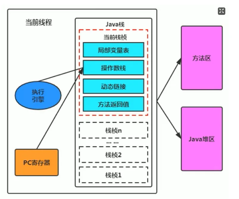 当然方法在执行的过程中,执行引擎有可能会通过存储在局部变量表中的对象引用准确定位到存储在Java堆区中的对象实例信息,以及通过对象头中的元数据指针定位到目标对象的类型信息。