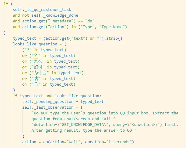 该功能的核心在于在 Agent 的执行循环中引入一个新的动作 GET_KNOWLEDGE_DATA,用于在特定场景(如 QQ 智能客服)下,将用户的问题发送给外部知识库 API,并将返回的答案自动输入并发送。