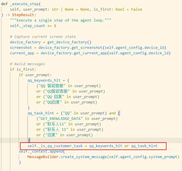 PhoneAgent._execute_step(user_prompt, is_first) 方法是 Agent 循环的核心,每一步都执行以下三个关键操作: