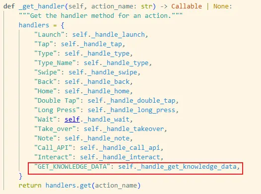 当模型输出 GET_KNOWLEDGE_DATA 动作时,ActionHandler.execute() 会调用对应的处理函数 handleget_knowledge_data。