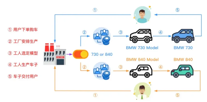 在上图中,模拟了用户购车的流程,小王和小秦分别向 BMW 工厂订购了 BMW730 和 BMW840 型号的车型,接着工厂会先判断用户选择的车型,然后按照对应的模型进行生产并在生产完成后交付给用户。
