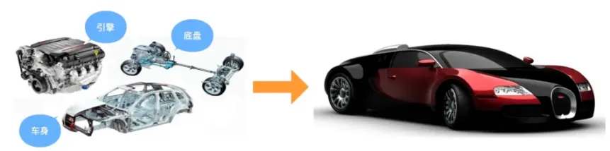 一辆小汽车 🚗 通常由 发动机、底盘、车身和电气设备 四大部分组成。汽车电气设备的内部构造很复杂,简单起见,我们只考虑三个部分:引擎、底盘和车身。