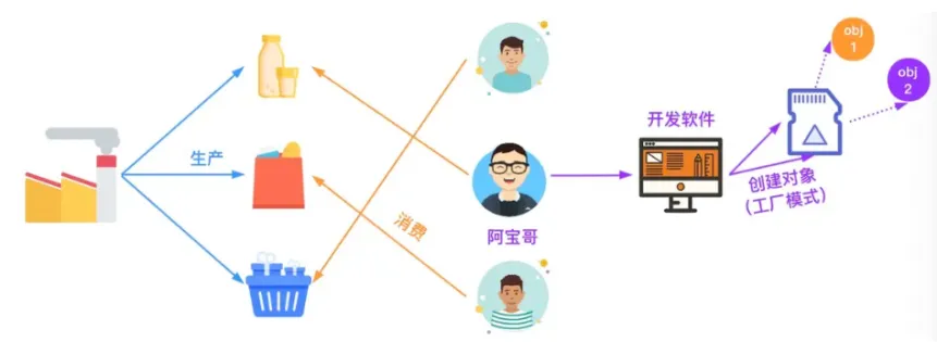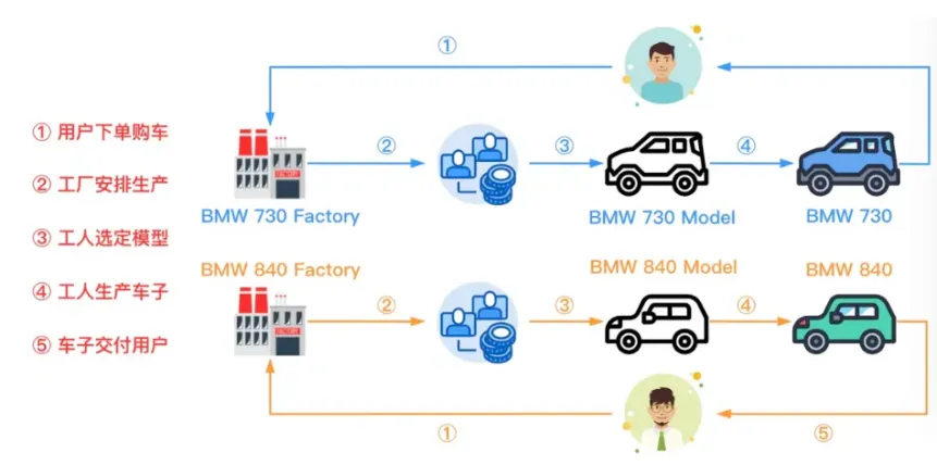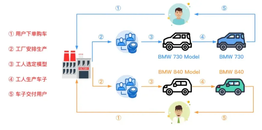 在上图中,模拟了用户购车的流程,小王和小秦分别向 BMW 730 和 BMW 840 工厂订购了 BMW730 和 BMW840 型号的车子,接着工厂按照对应的模型进行生产并在生产完成后交付给用户。