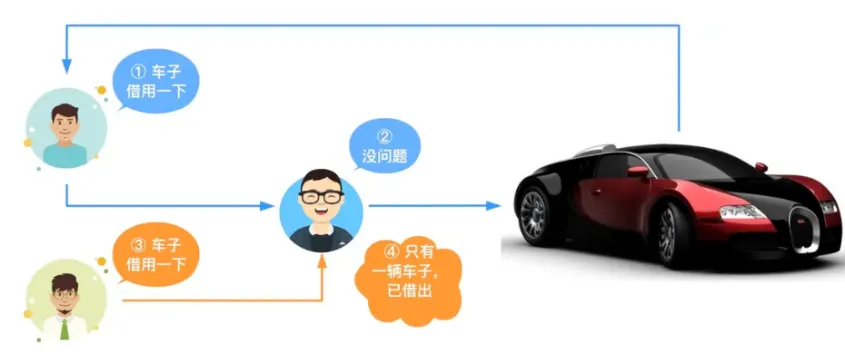在上图中,模拟了借车的流程,小王临时有急事找曼波哥借车子,曼波哥家的车子刚好没用,就借给小王了。当天,小秦也需要用车子,也找曼波哥借车,因为曼波哥家里只有一辆车子,所以就没有车可借了。